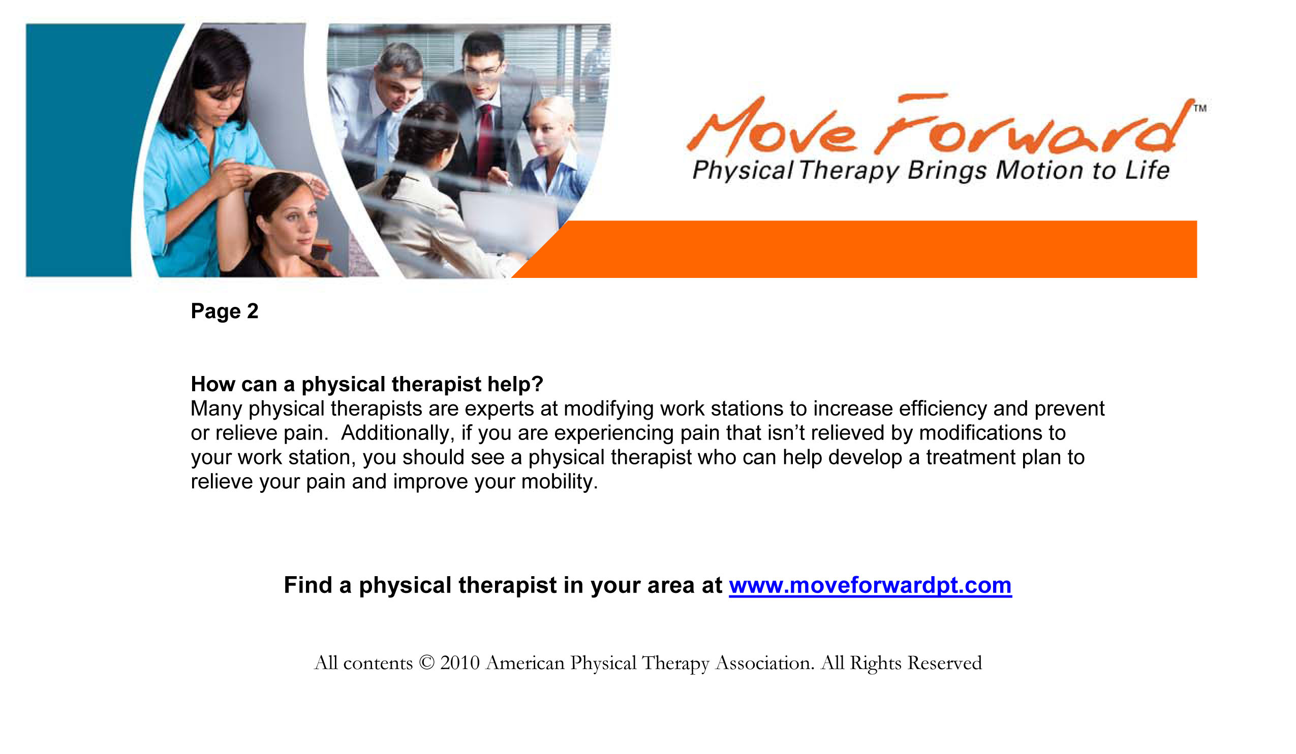Here we will be posting some information about many different subjects within Physical Therapy. Today we are going to focus in on Workplace Wellness. Is your desk at work set up correctly? Is the position of your keyboard set correctly? Workplace wellness is a key to a healthy work lifestyle. Using these techniques given can help you out at work or at home. So here are some helpful tips for your workplace or your home office. Take a look and try some of these tips out!